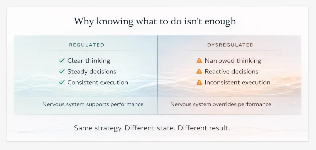 More specifically, what happens to decision quality, emotional resilience, strategic thinking, and self-regulation when the nervous system shifts out of regulation under pressure. And what becomes possible when you can hold more without it costing you what it currently does.
